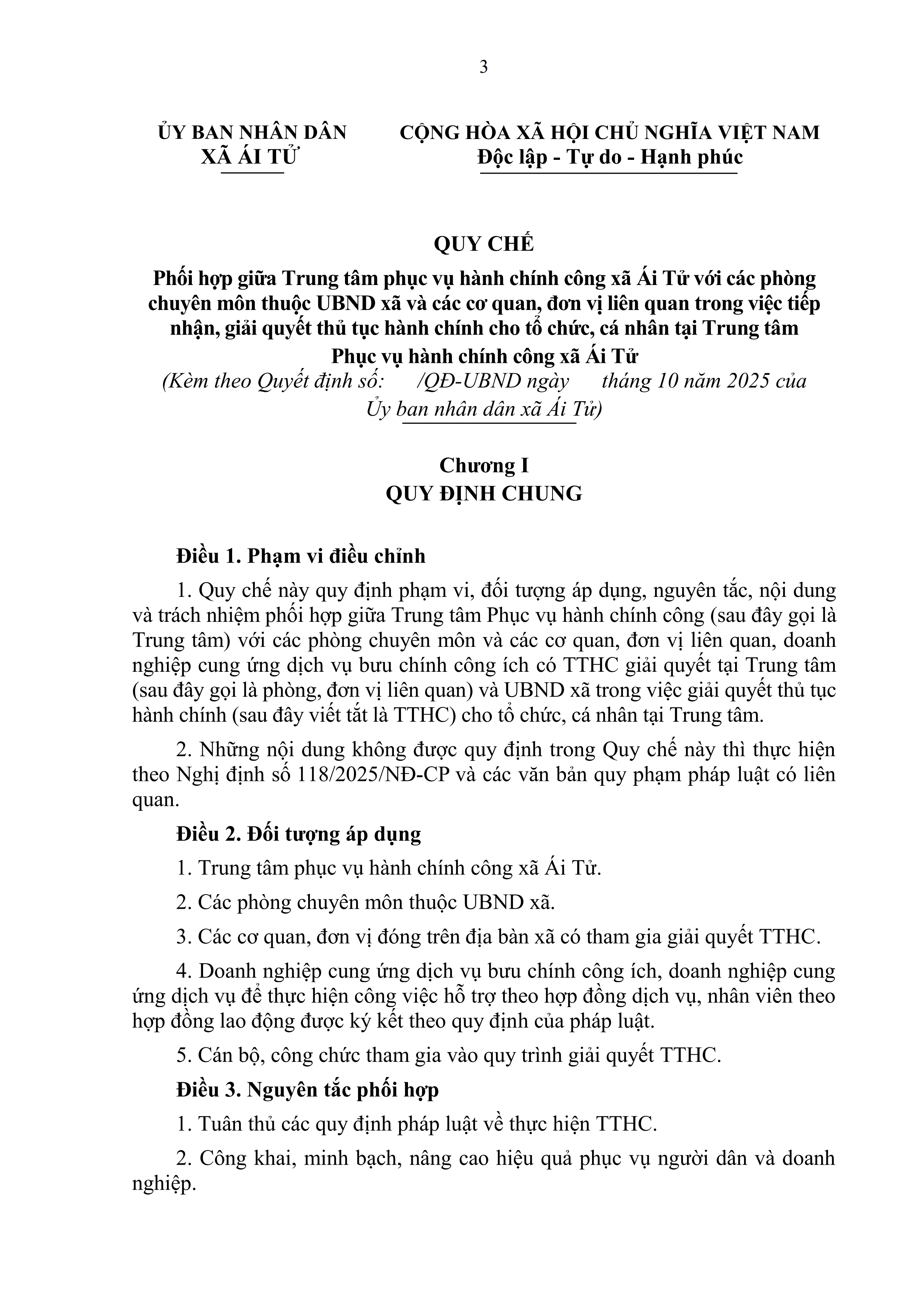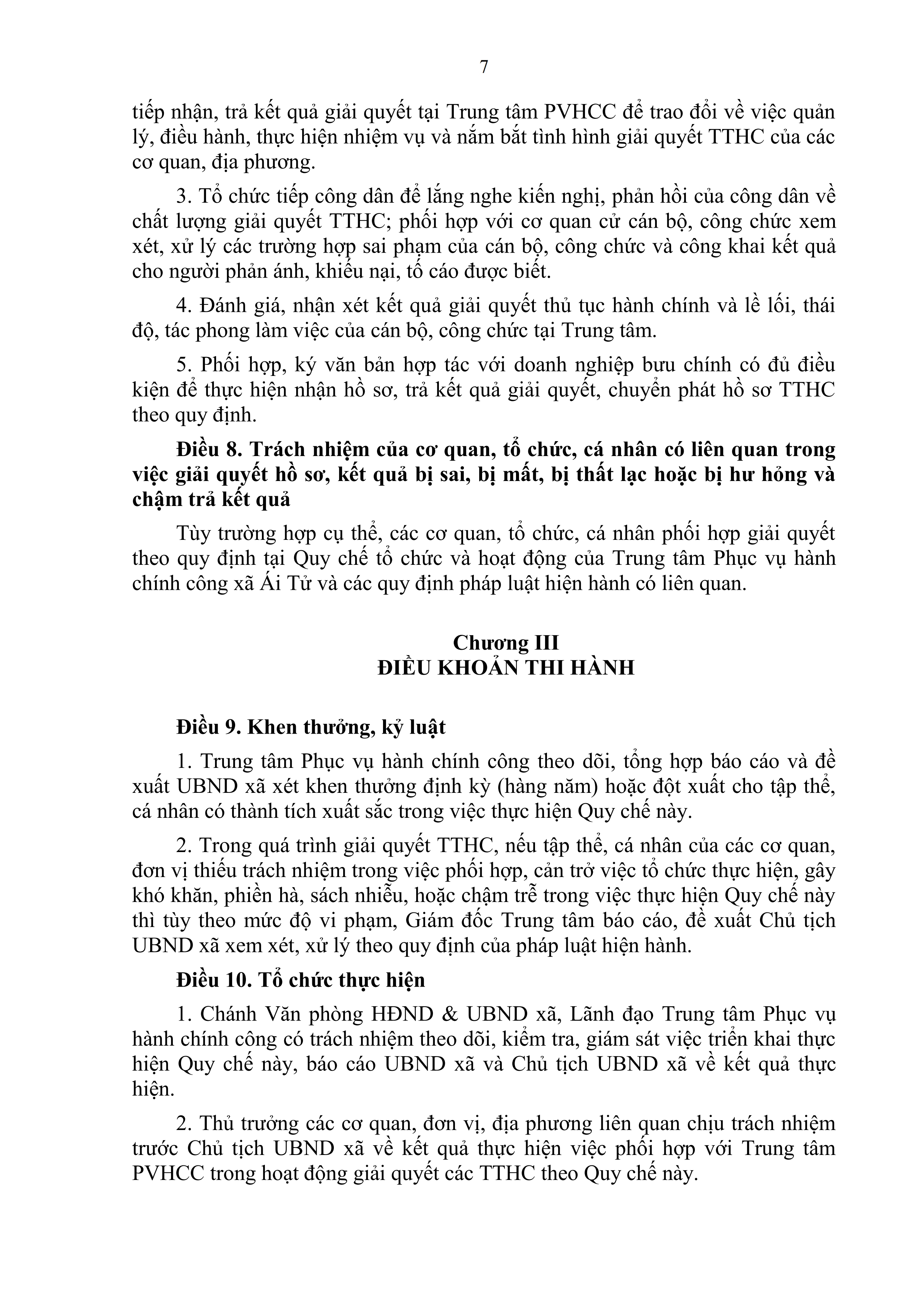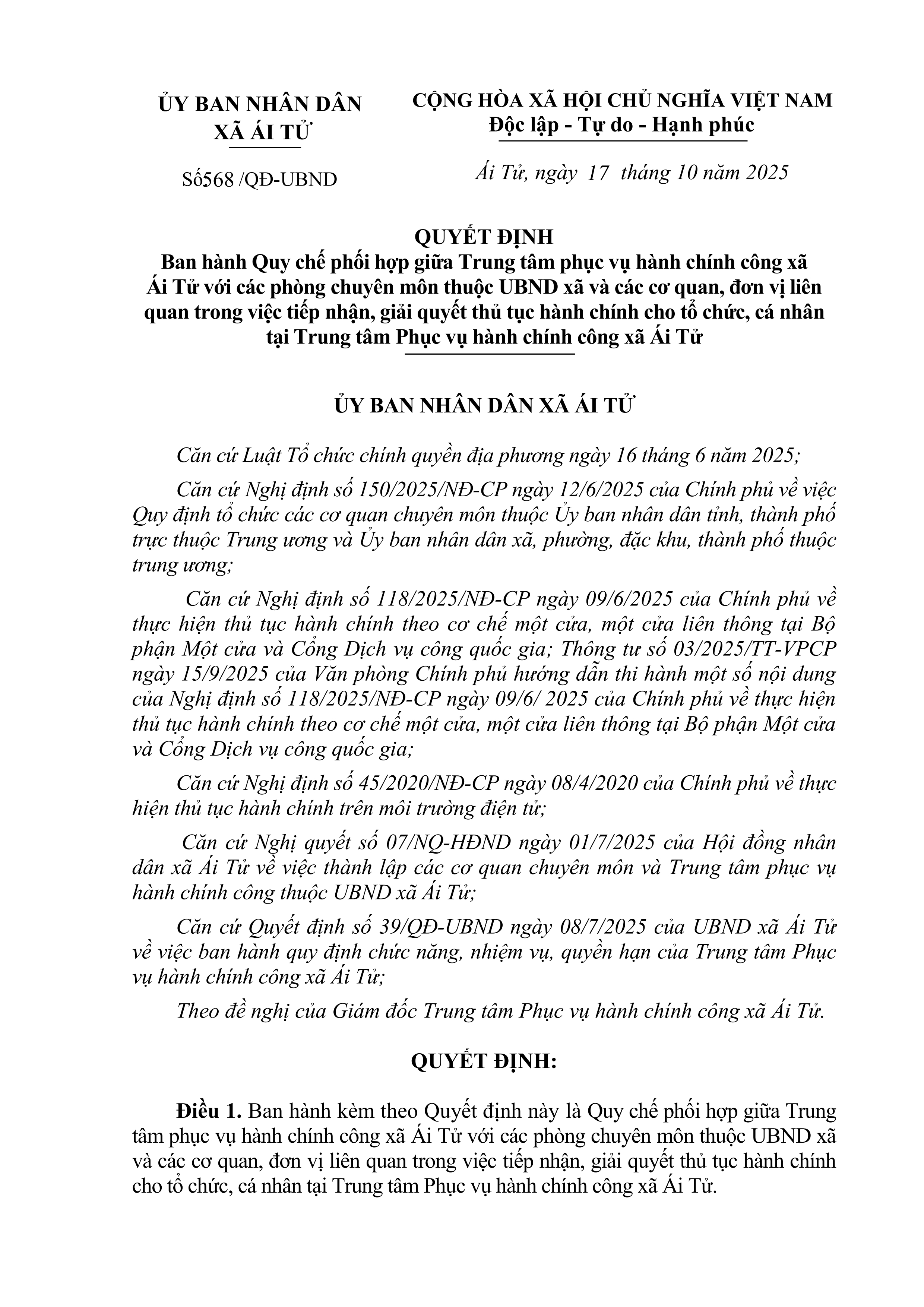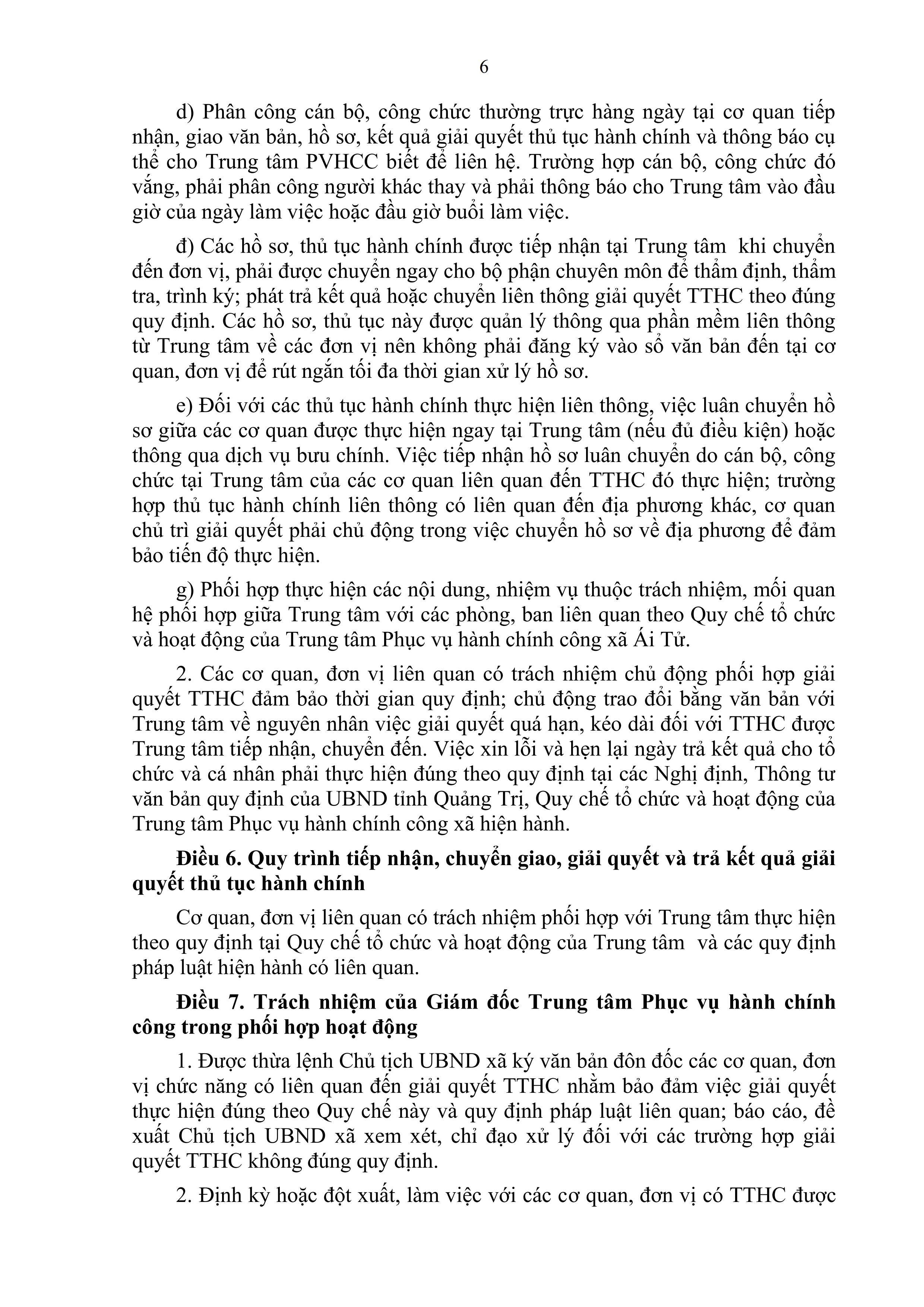 Quy chế phối hợp giữa Trung tâm phục vụ hành chính công xã Ái Tử với các phòng chuyên môn thuộc UBND xã và các cơ quan, đơn vị liên quan trong việc tiếp nhận, giải quyết thủ tục hành chính cho tổ chức, cá nhân tại Trung tâm Phục vụ hành chính công xã Ái Tử