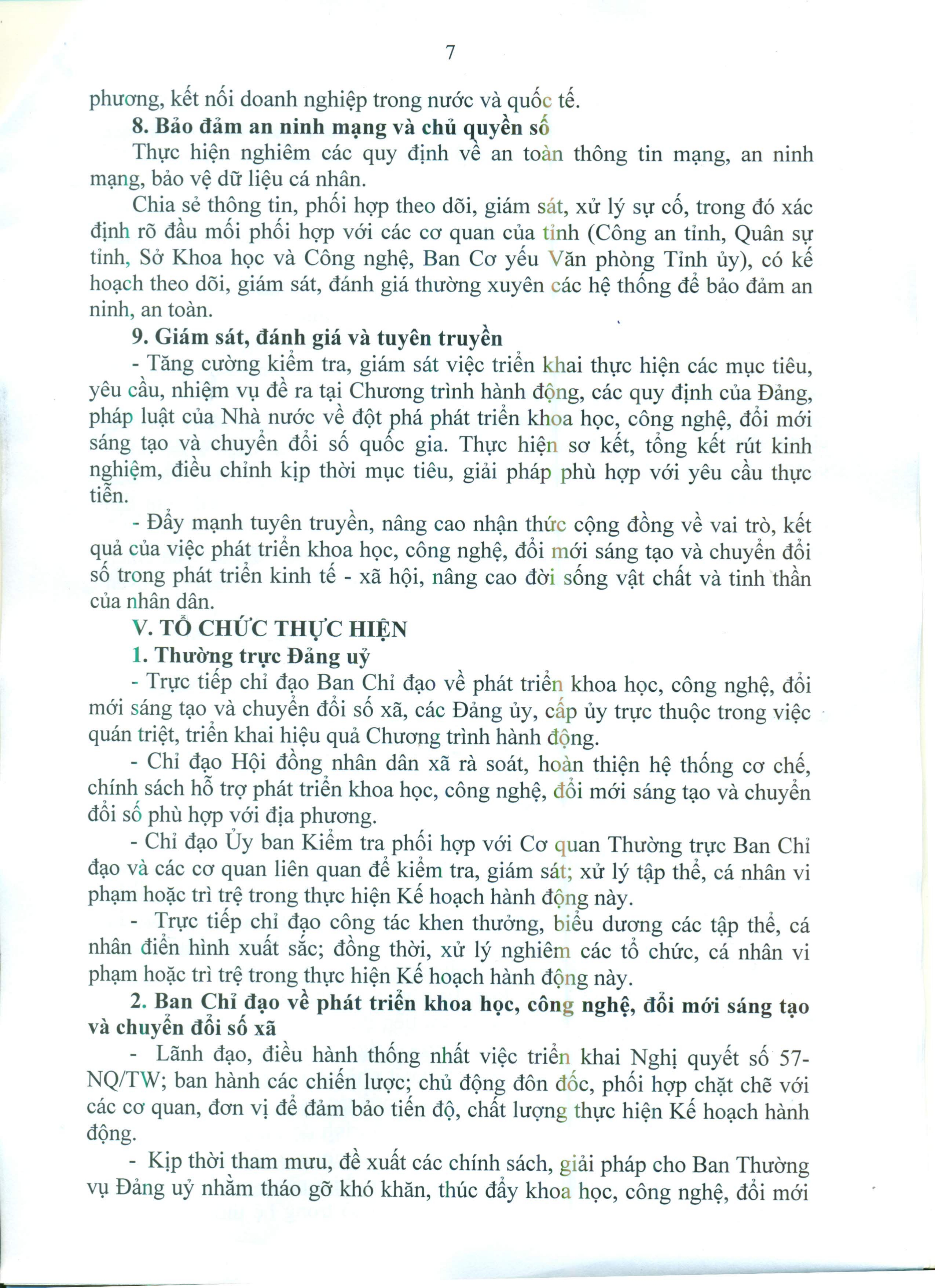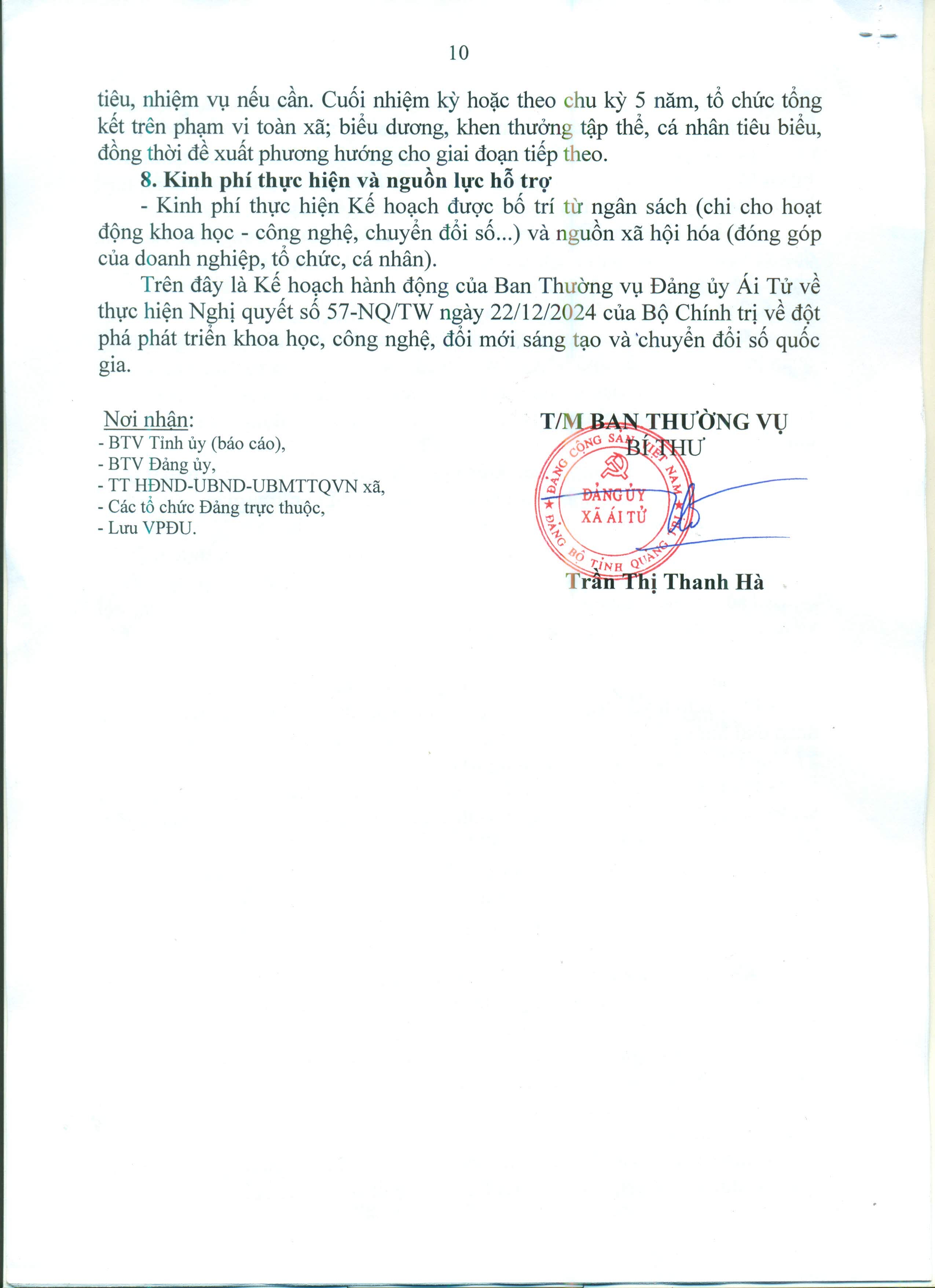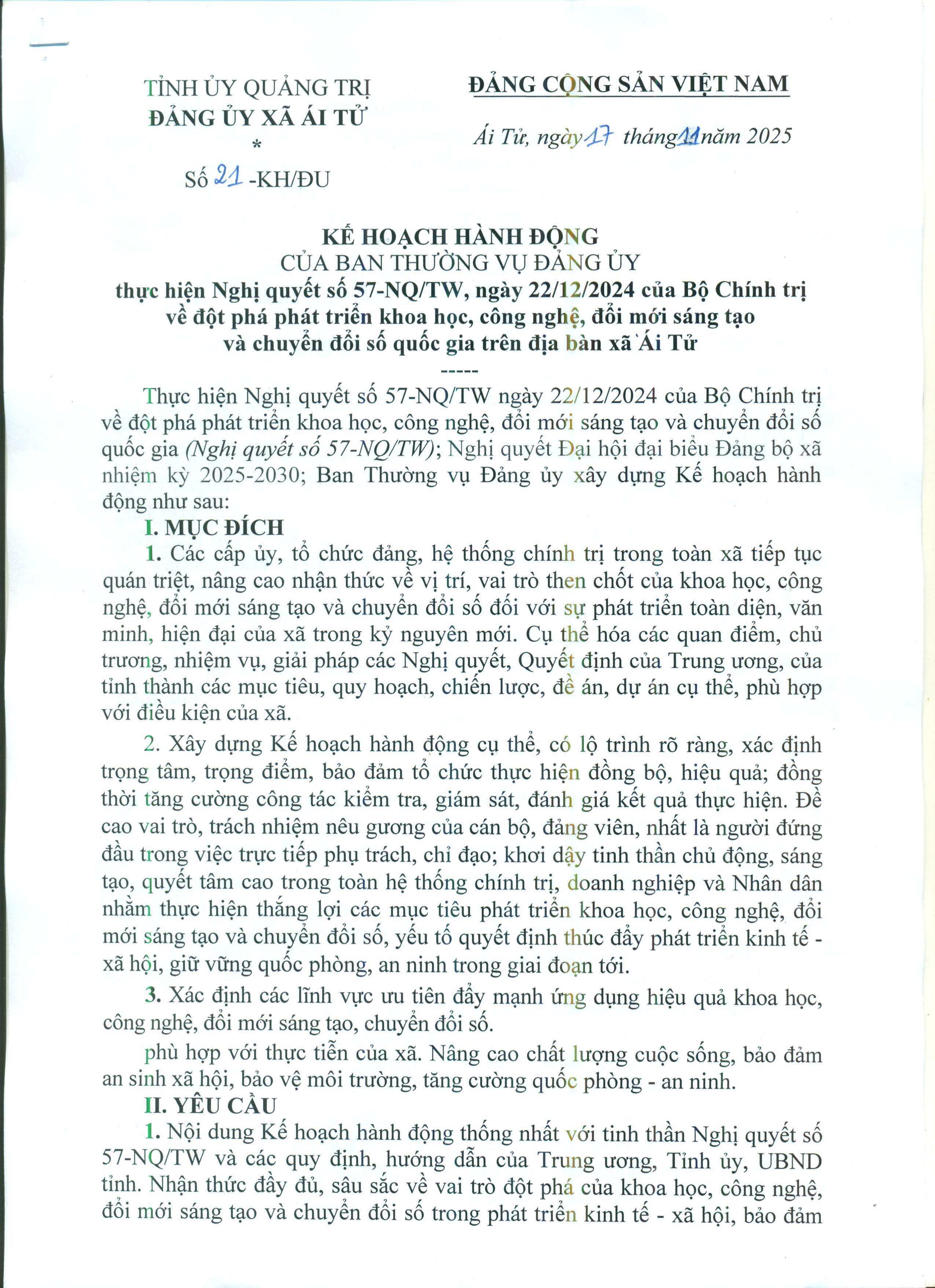Kế hoạch hành động của Ban Thường vụ Đảng uỷ thực hiện Nghị quyết số 57-NQ-TW ngày 22/12/2024 của Bộ Chính trị về đột phát phát triển khoa học, công nghệ, đổi mới sáng tạo và chuyển đổi số quốc gia trên địa bàn xã Ái Tử