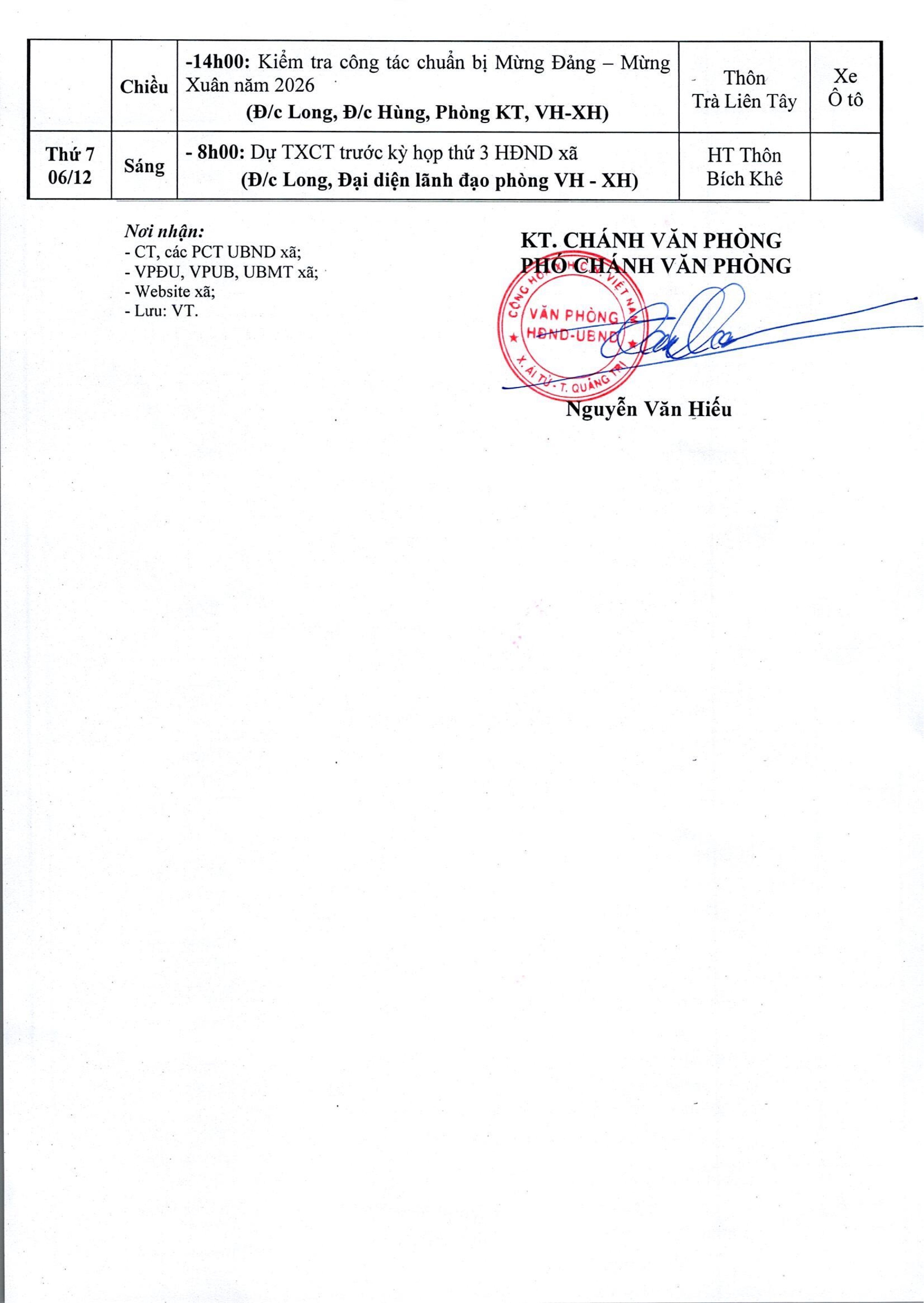 Lịch làm việc của UBND xã Ái Tử từ ngày 01 đến 05 tháng 12